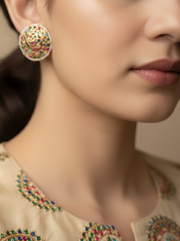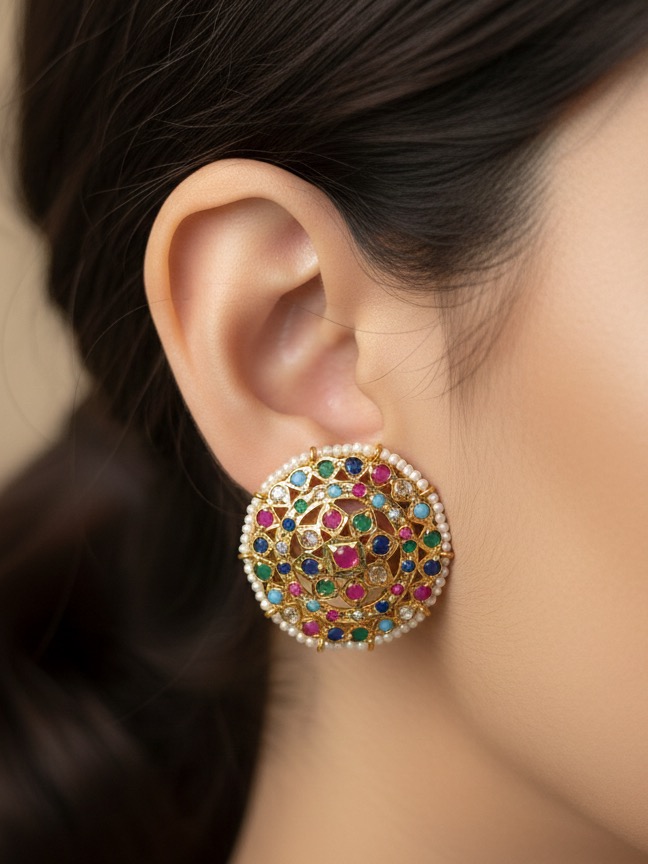 •Adorned with vibrant navratan stones arranged in an intricate circular design.