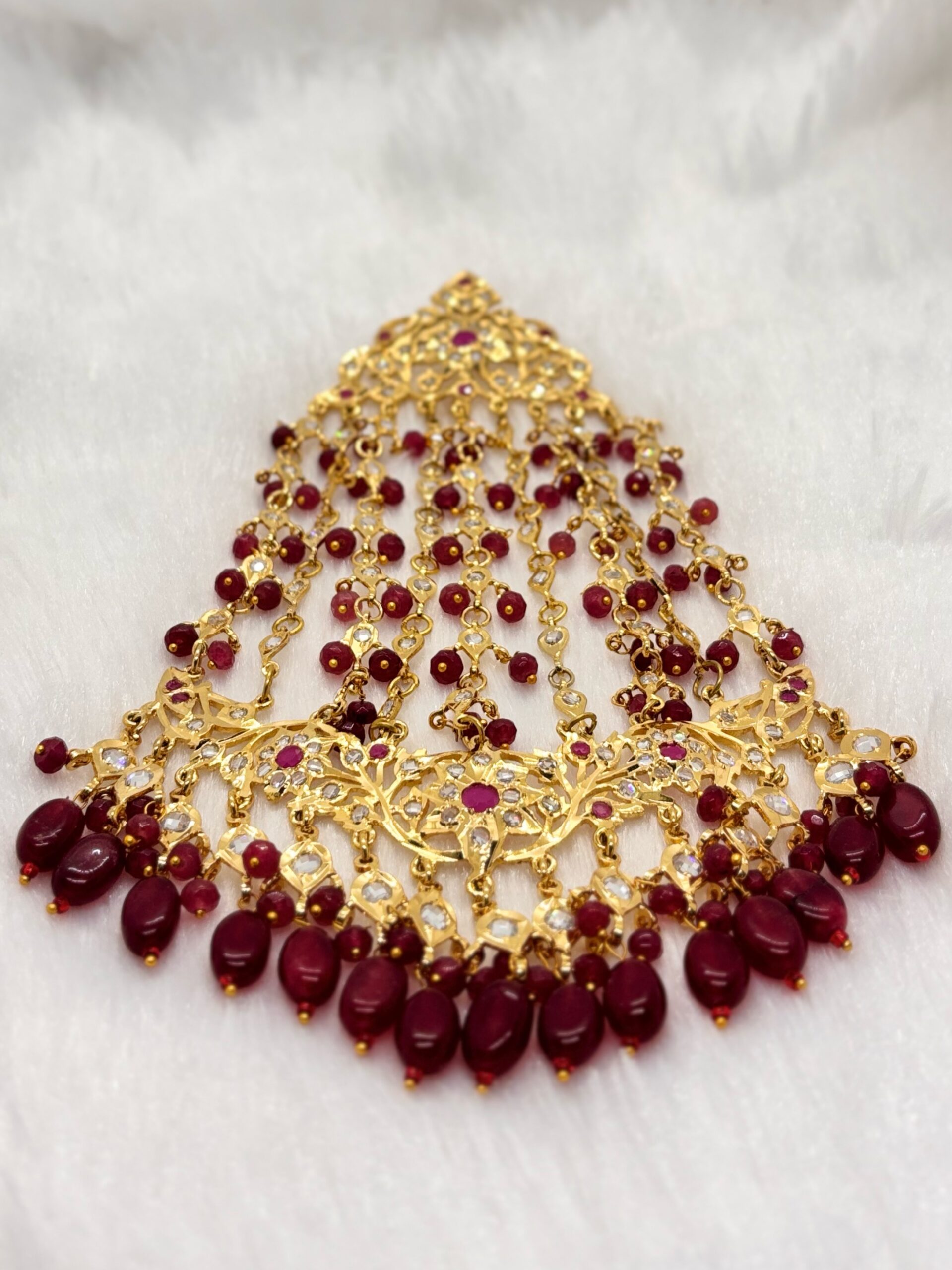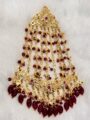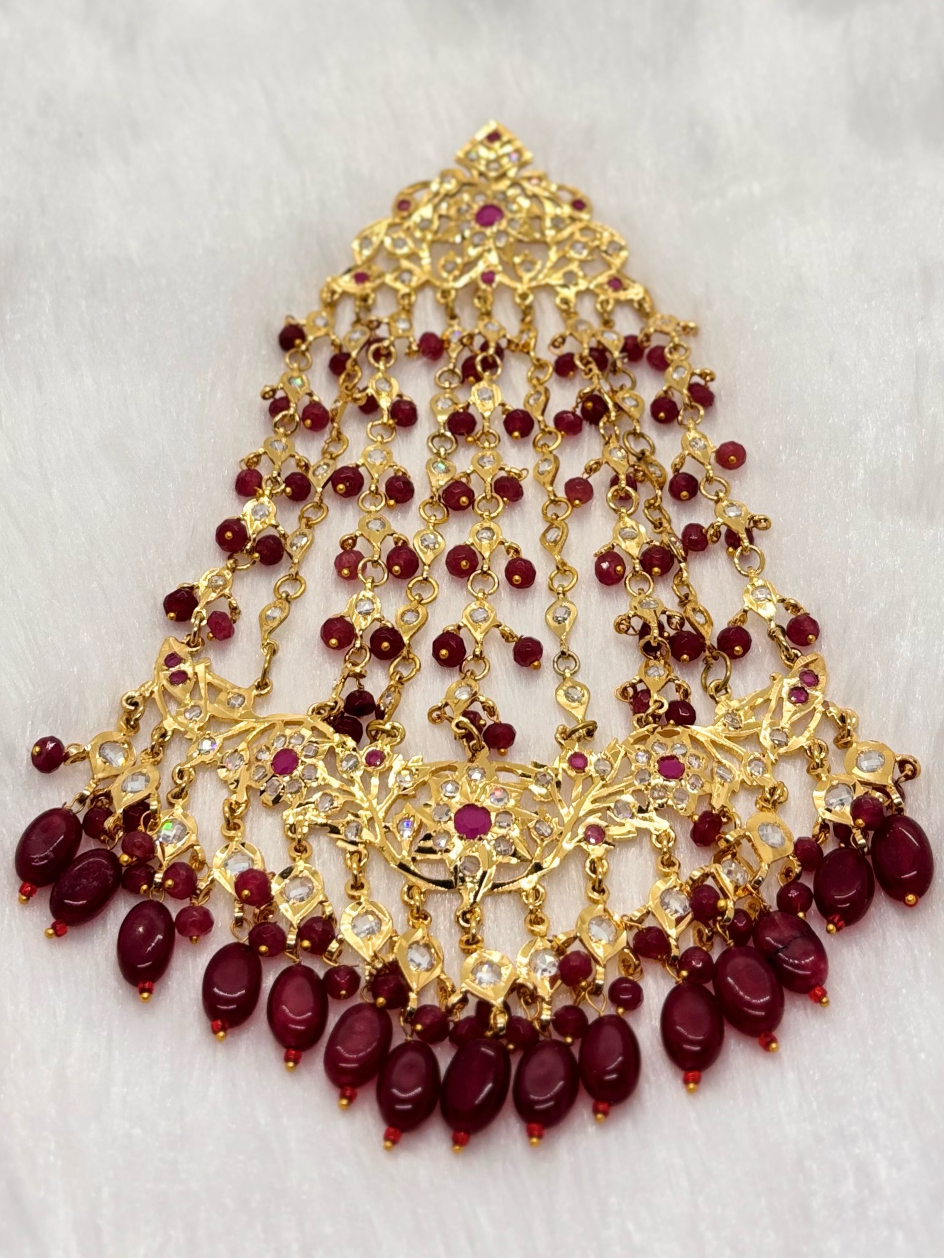 - Features cascading chains with rich red bead drops for a regal bridal look.