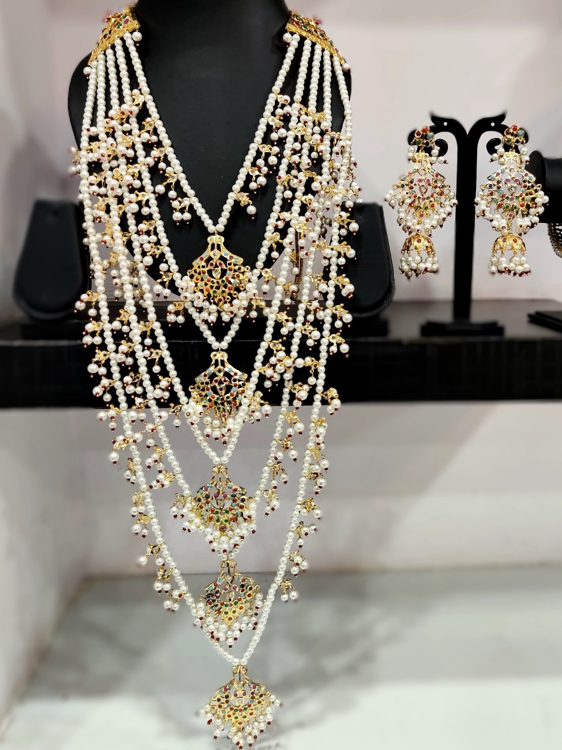 Gold Plated Jadau Navratan Pearl Layered Long Haar Set