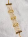 Elevate your wrist with this elegant Hyderabadi gold plated bracelet, beautifully crafted with multiple strands of fine pearls and detailed with traditional gold plated with polki stones. The intricate geometric accents add a regal charm, making this piece a perfect blend of classic heritage and timeless sophistication.