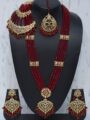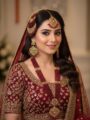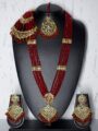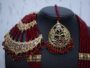 Exuding royal grandeur, this bridal jewelry set is crafted to make a timeless statement. Featuring a richly layered ruby-toned beaded necklace adorned with intricate gold-finished motifs, the set is designed to elevate traditional bridal ensembles. The look is completed with matching statement earrings and an exquisitely detailed matha patti, adding regal charm and symmetry to the bride’s silhouette.