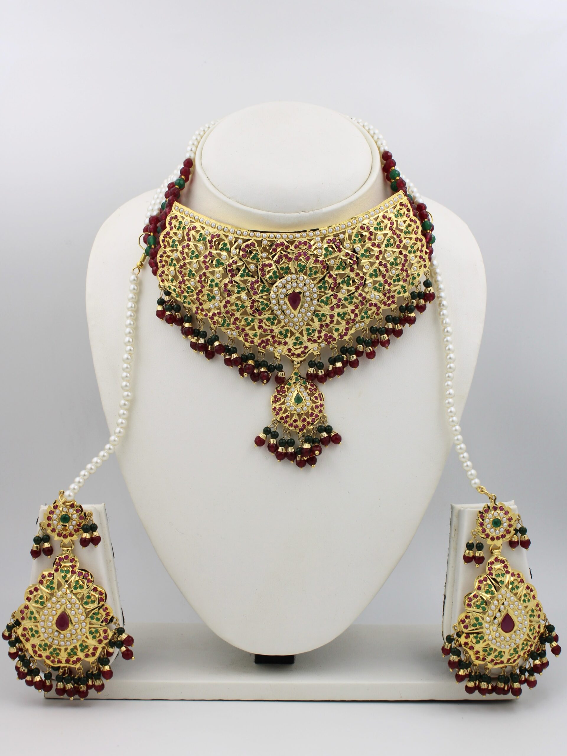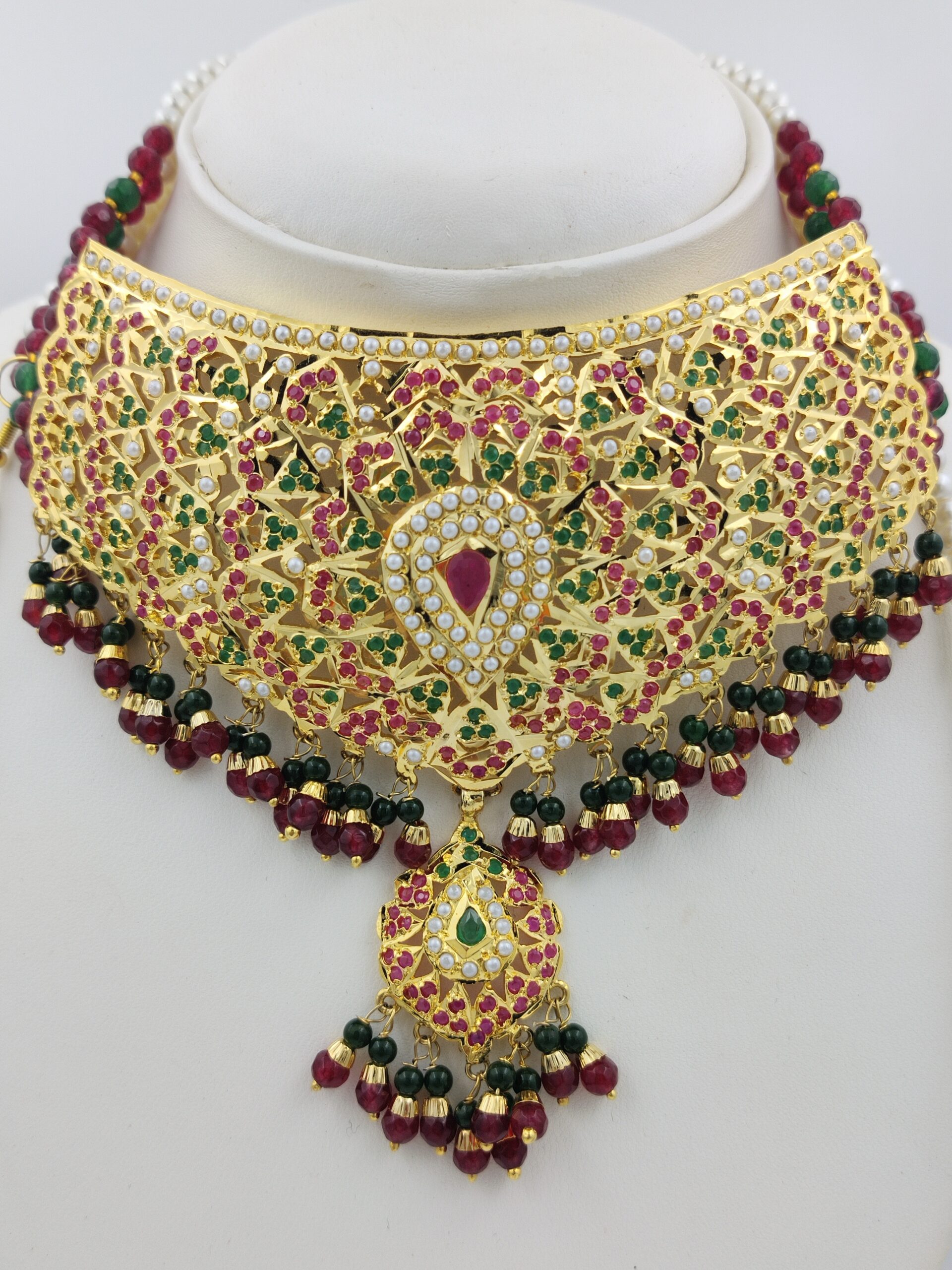 Embrace regal elegance with this gold plated jadau choker set, a masterpiece of traditional craftsmanship and timeless beauty. Designed for the modern bride with a love for heritage, this stunning set features intricate jadau detailing adorned with rich ruby and emerald stones.The broad choker is embellished with delicate pearl strings and fine handwork, creating a magnificent fusion of color and sparkle. The matching statement earrings and pendant drop enhance its royal appeal, making it a perfect choice for weddings, sangeet, or grand festive occasions.Crafted to perfection, this heavy bridal choker set reflects the opulence and grandeur of Amritsari artistry — a true symbol of luxury, tradition, and grace.