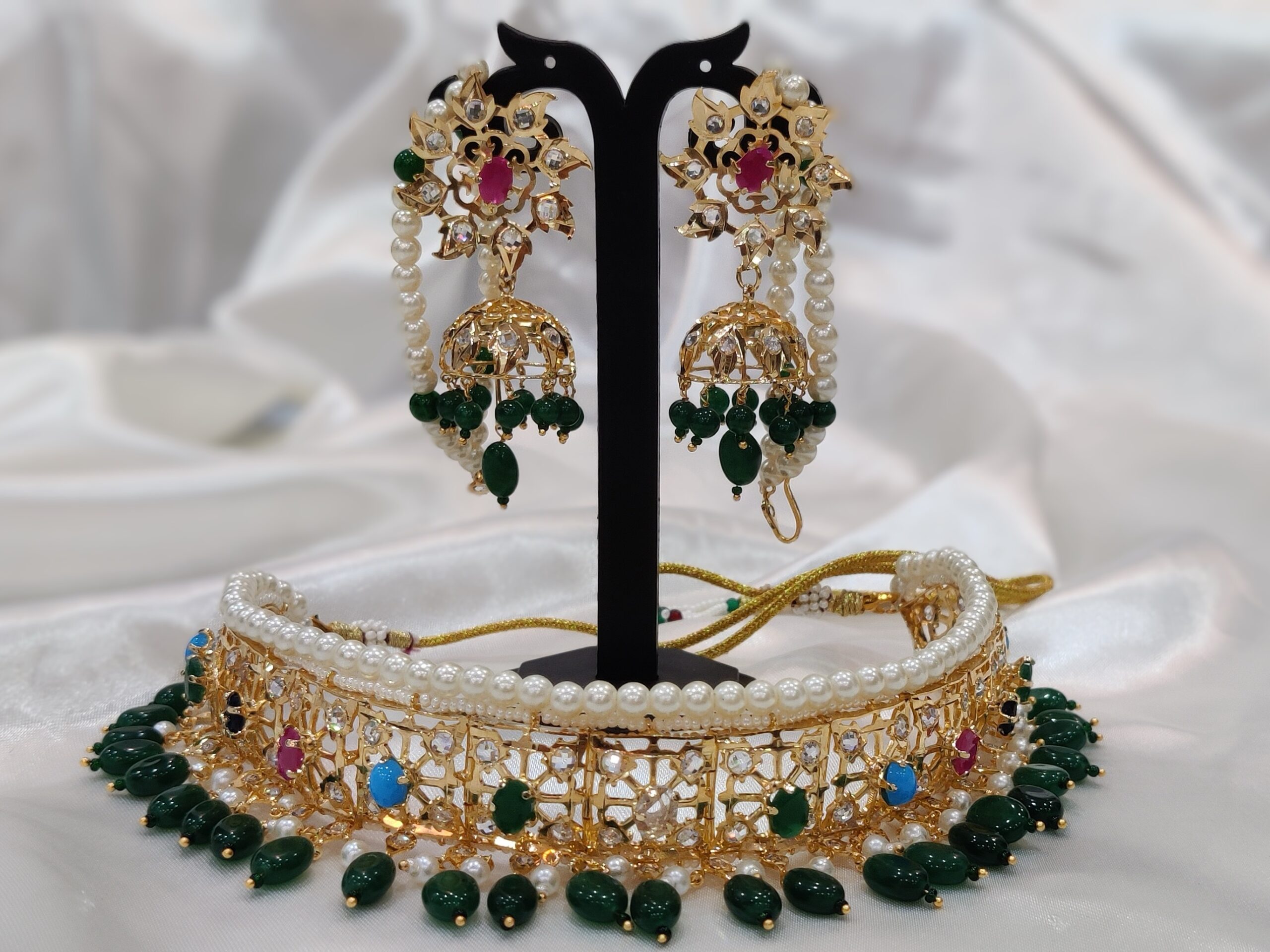 The detailed lattice craftsmanship and the stunning play of multicolour and green tones evoke the splendor of heritage jewelry, making it perfect for brides, festive celebrations, and special occasions. Paired with matching jhumka earrings, this set exudes sophistication and luxury — a perfect blend of tradition and timeless beauty.