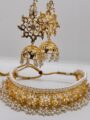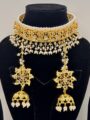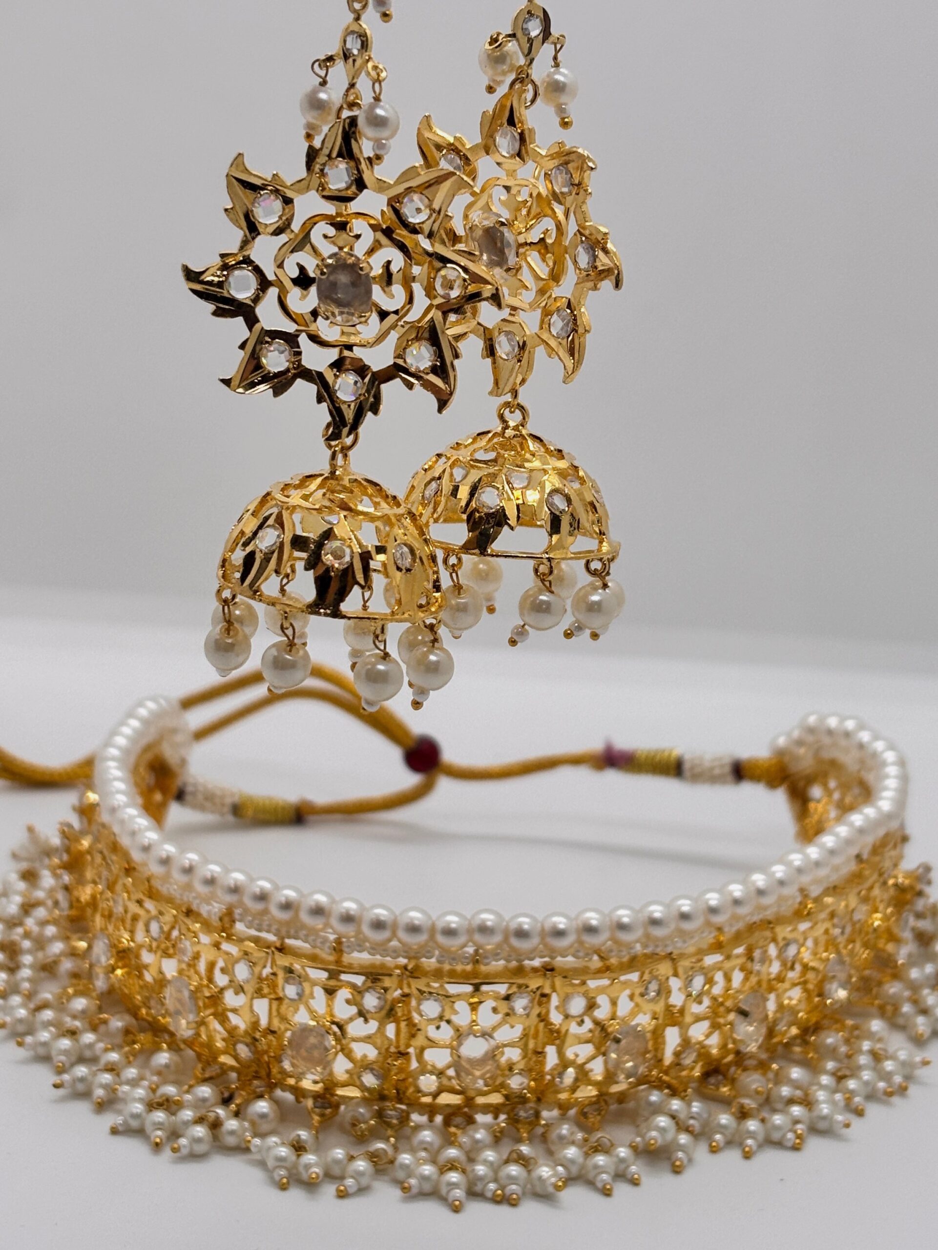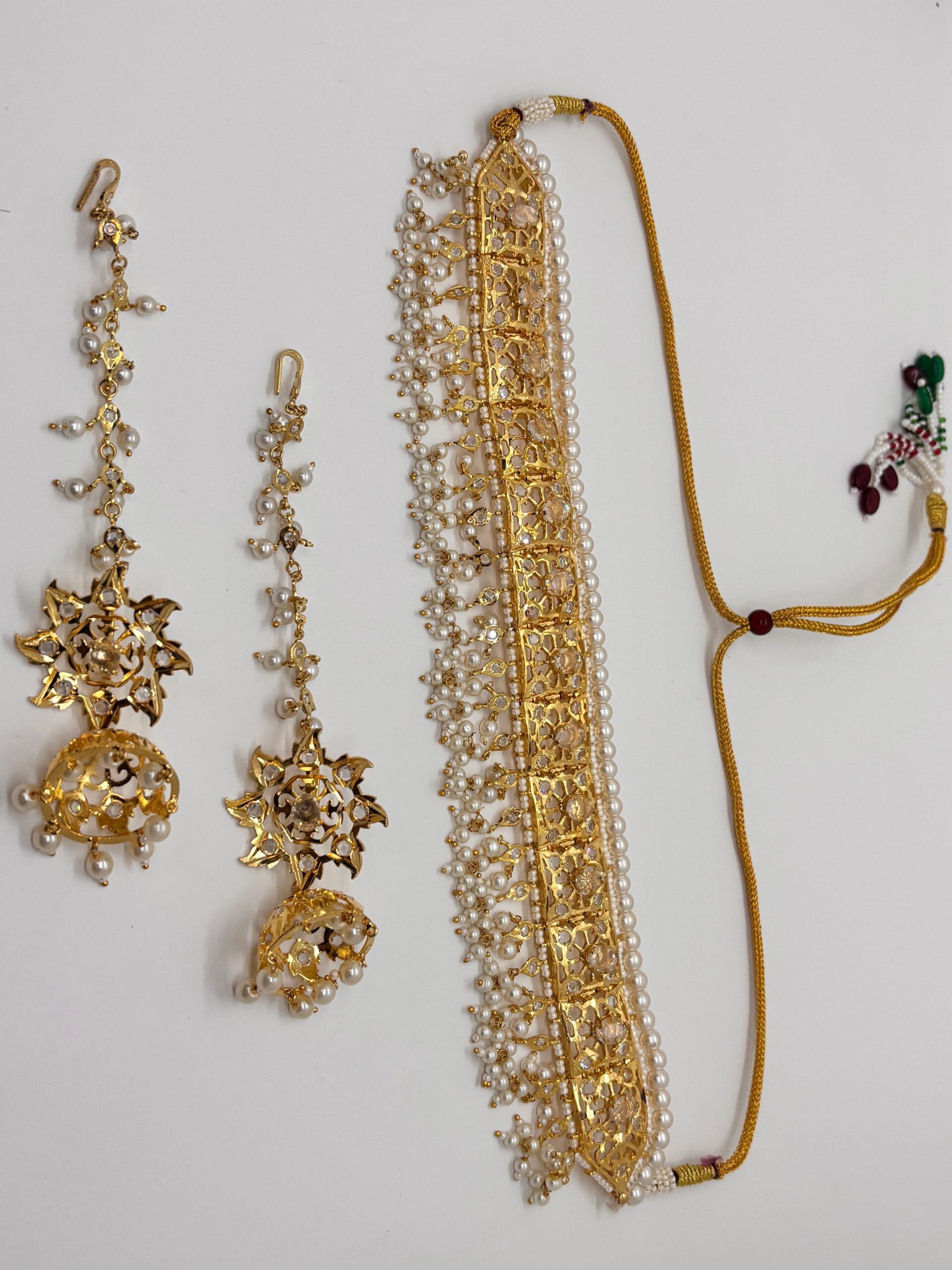 A timeless ode to regal Nizami craftsmanship, this exquisite Nizami Lachha features intricate gold-plated jaali work adorned with delicate pearl clusters. The broad lachha design sits gracefully on the neckline, exuding old-world charm and royal elegance. Paired with matching handcrafted karanphool, this set is perfect for brides and festive occasions that call for grandeur.