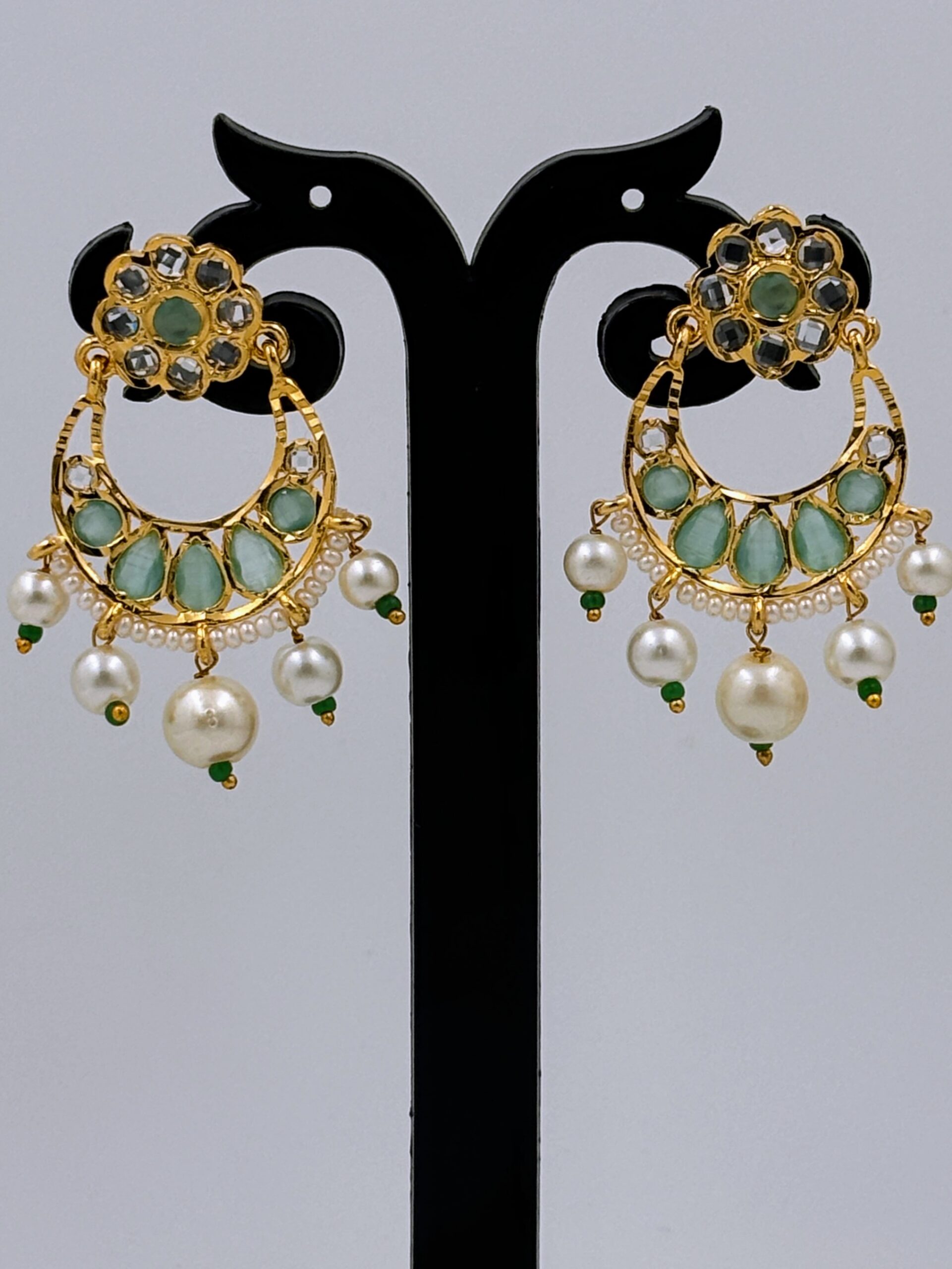 Gold Plated mint Green Stone & Pearl Drop Earrings