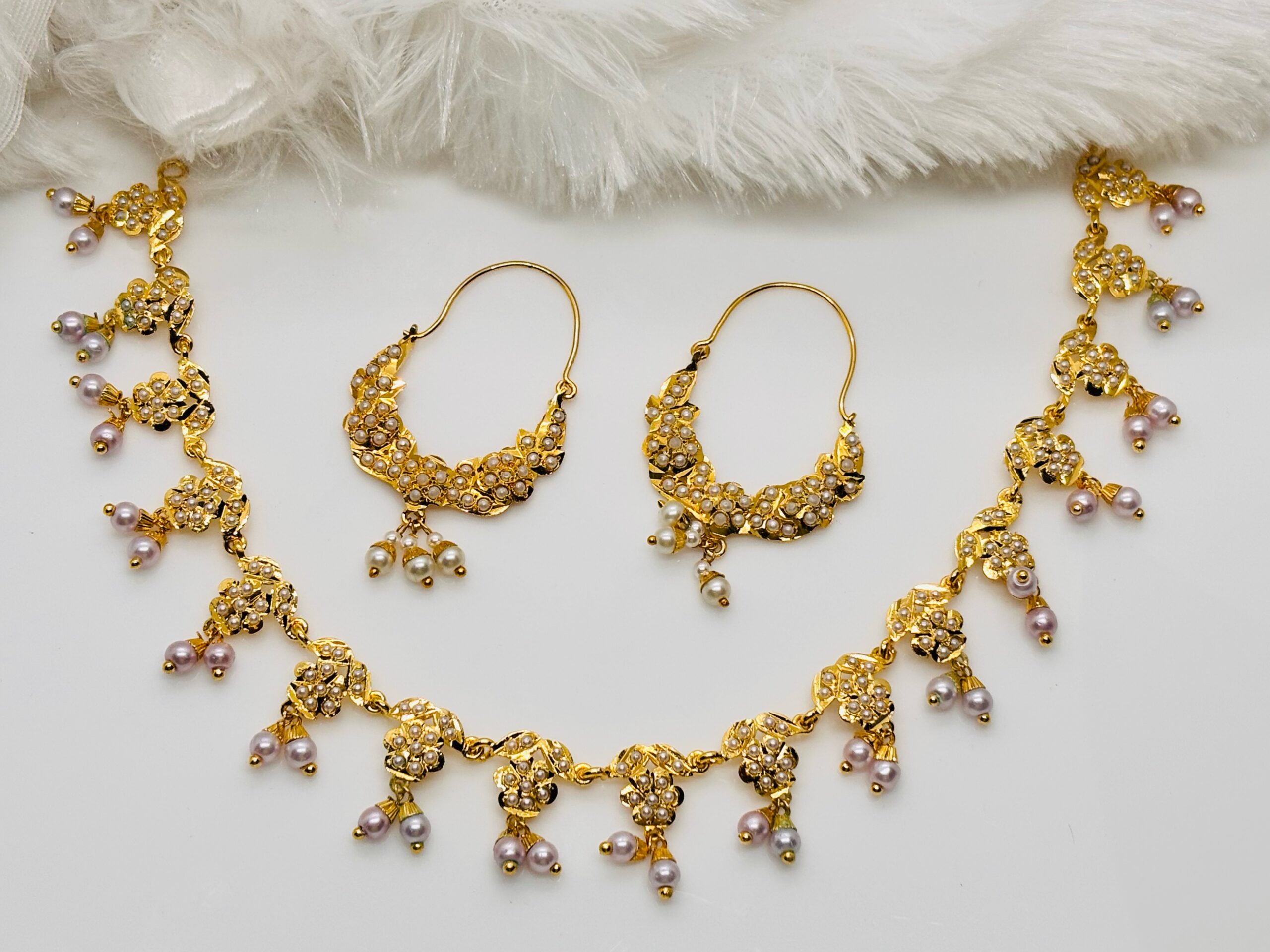 - Comes with matching hoop-style earrings (baali) with pearl drops