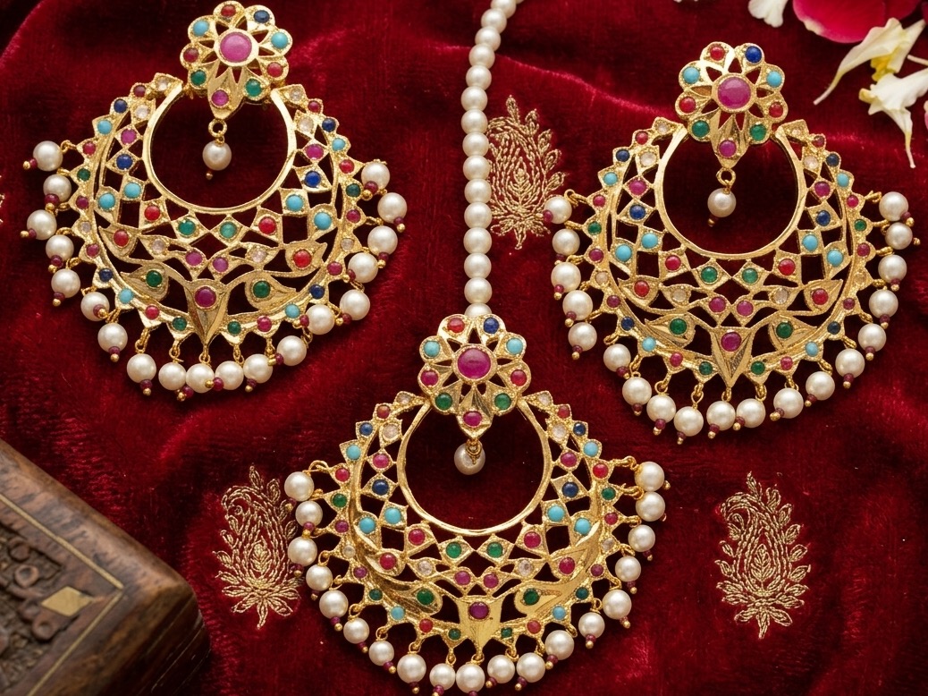 - Traditional Hyderabadi earrings set paired with a matching tika