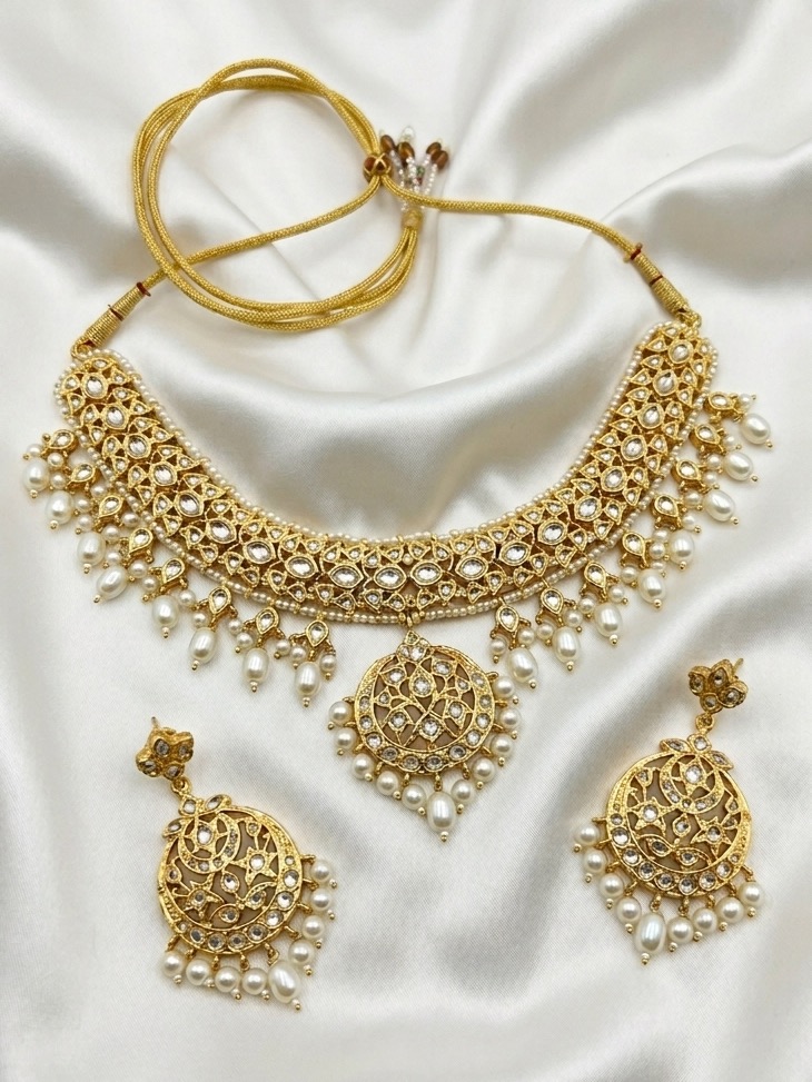 • Elegant Hyderabadi Polki choker set paired with matching chandbali earrings and pendant