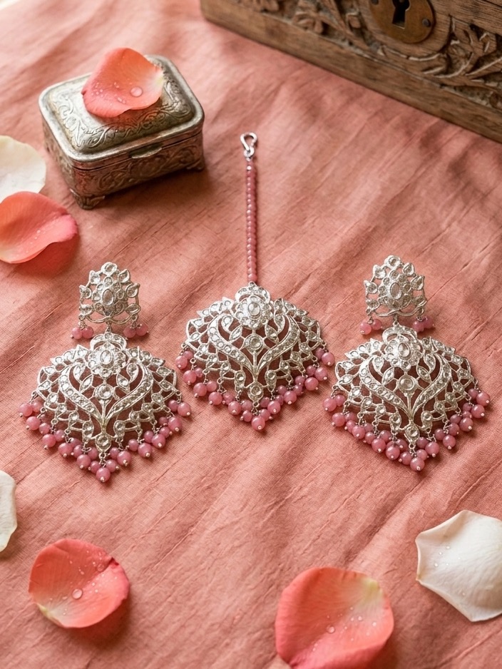 - Elegant Hyderabadi earring and tika set crafted in intricate traditional design