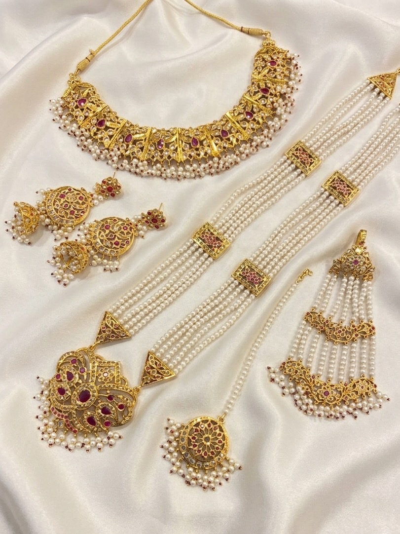 - Includes a complete bridal set: necklace , long necklace (ranihaar), jhumka earrings, jhoomer (passa), and maang tika