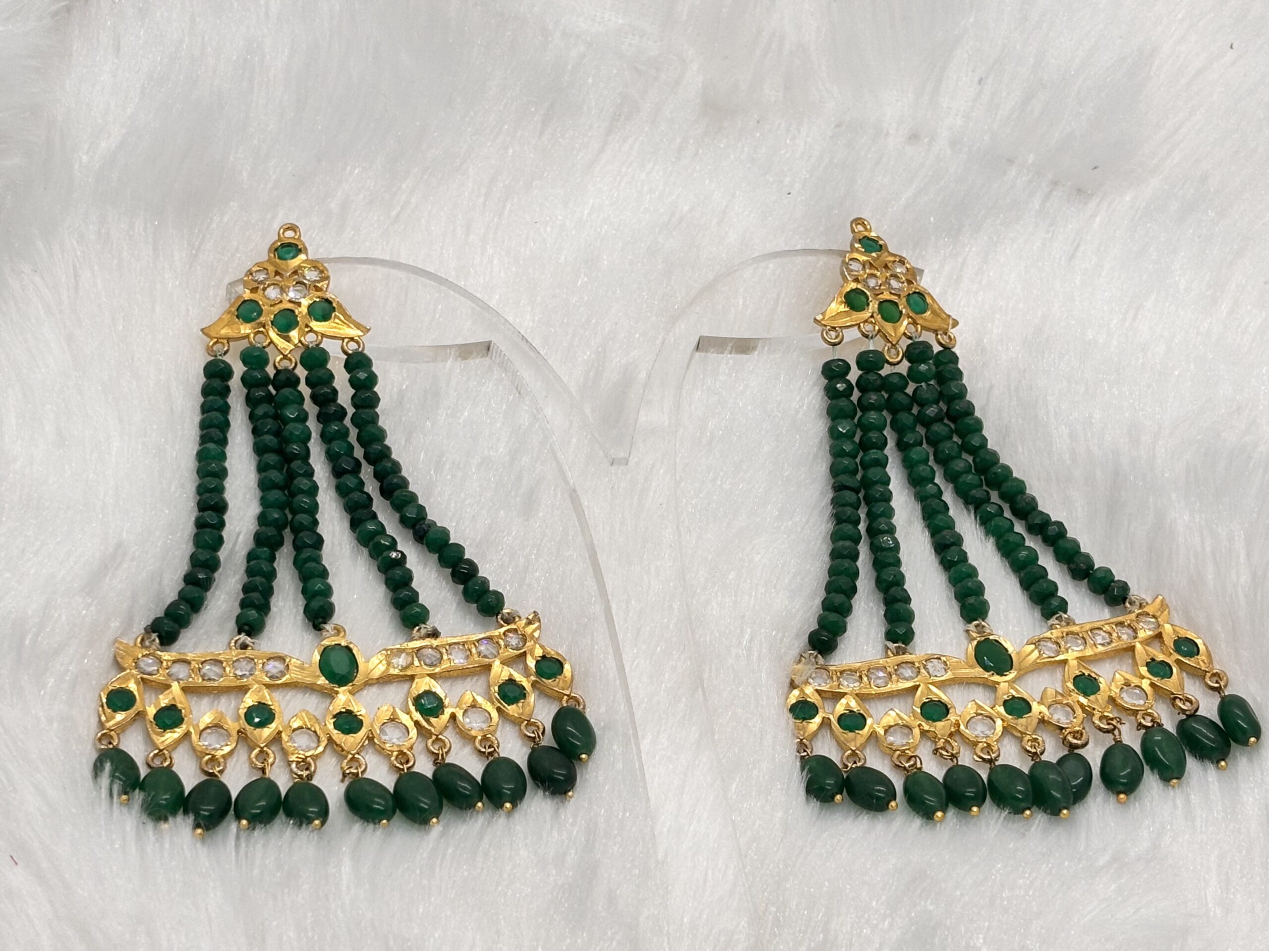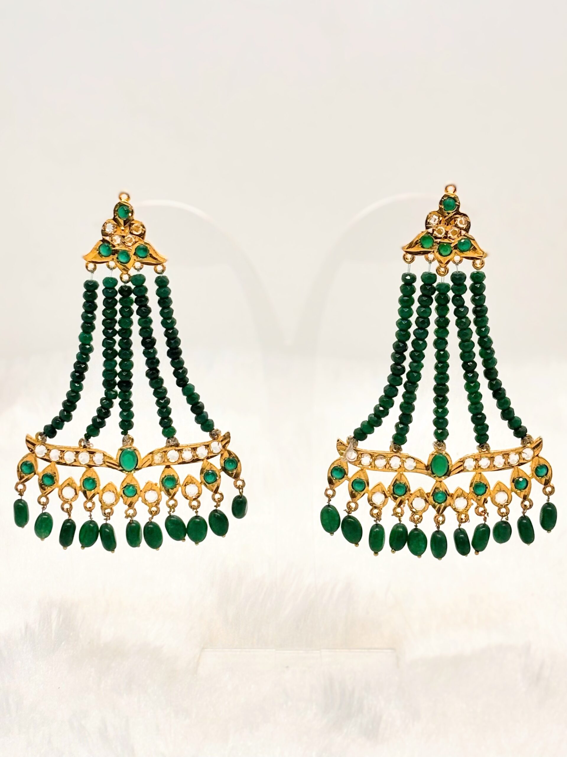 • Elegant Hyderabadi jhoomer earrings inspired by traditional royal jewellery.
