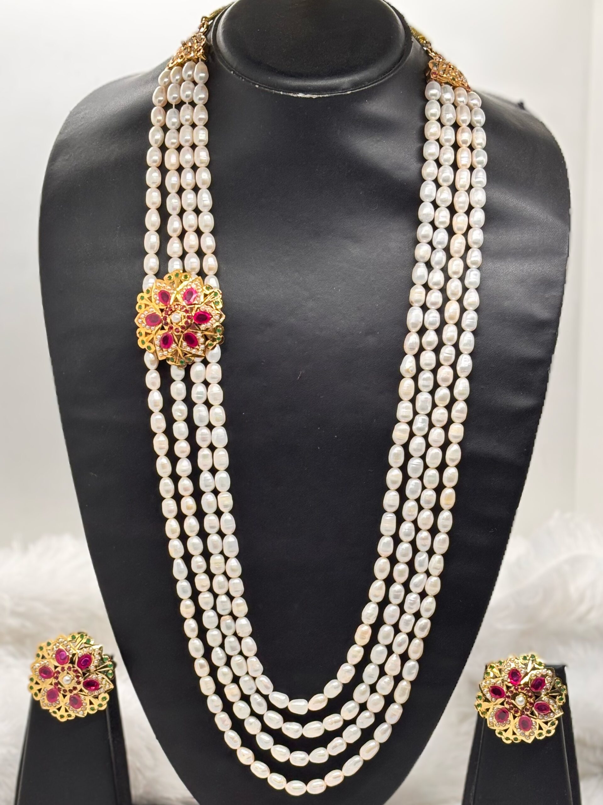 • Elegant Jadau stud earrings with layered pearl maala, inspired by traditional royal jewellery.
