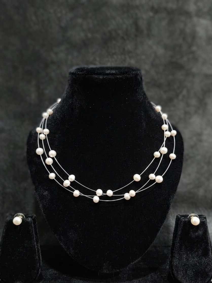 - Elegant contemporary style pearl set featuring a multi-layered real pearl necklace with matching pearl studs.