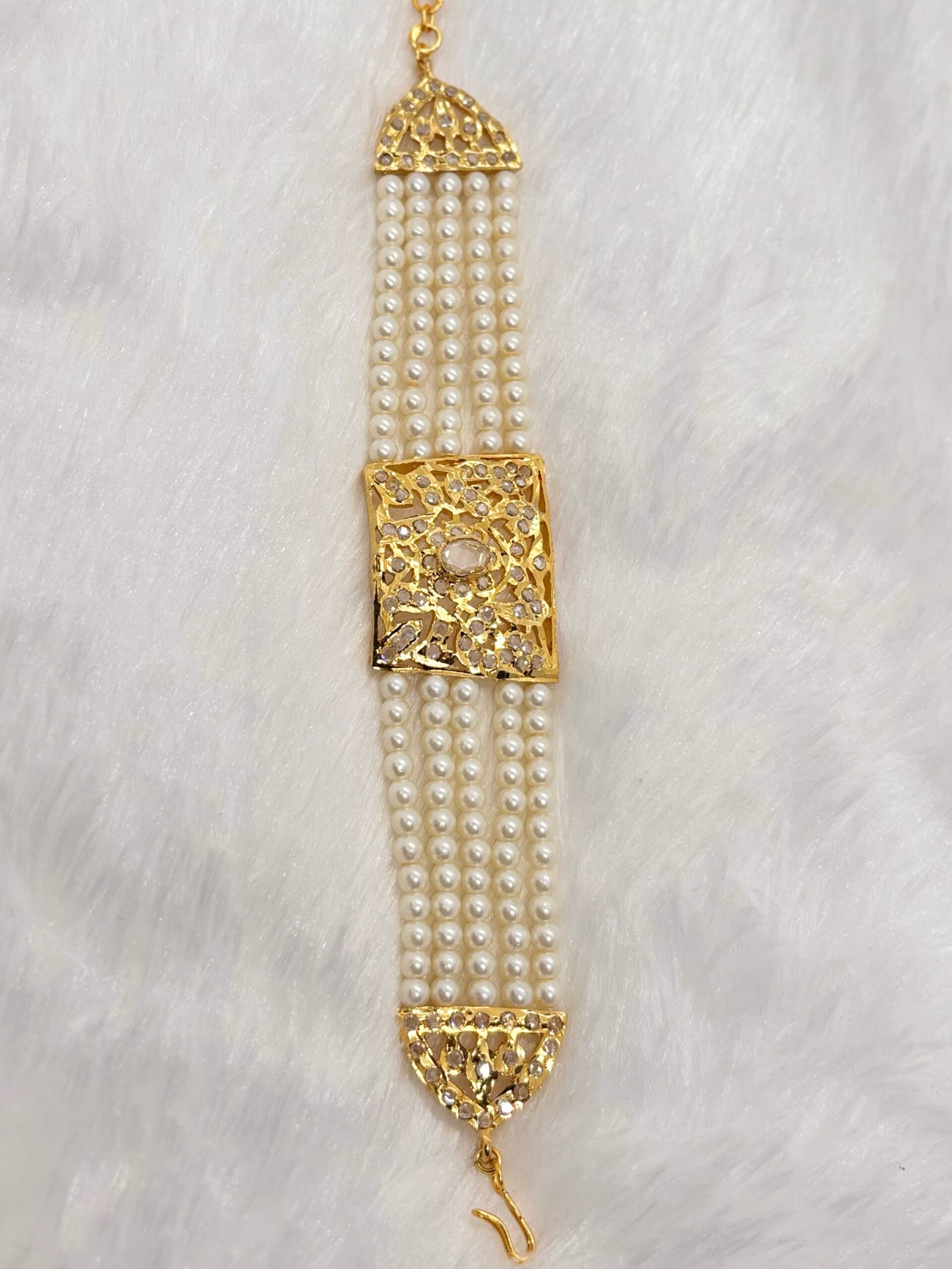 • Classic Hyderabadi-style pearl bracelet with intricate gold plated work