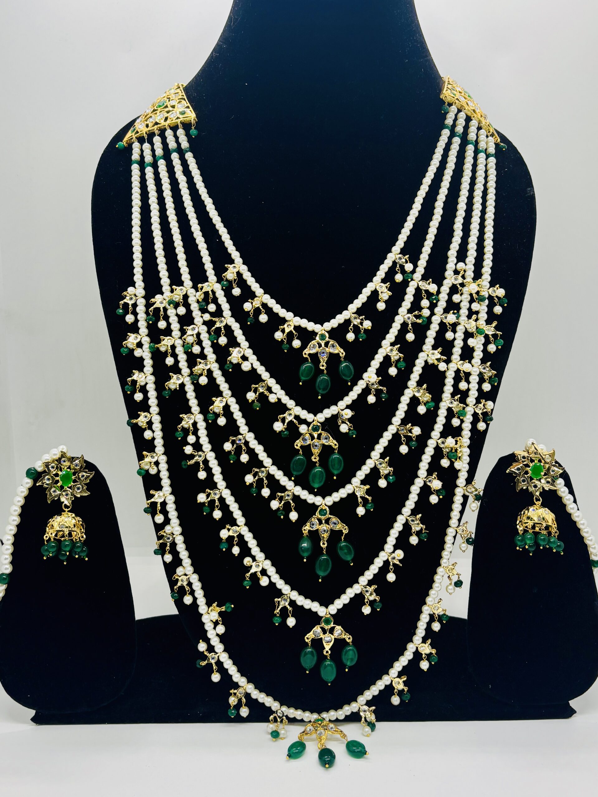 Step into royal elegance with this magnificent gold-plated Hyderabadi Satlada Haar, a true reflection of timeless Nizami artistry. This seven-layered masterpiece is meticulously handcrafted with rows of lustrous white pearls, gracefully cascading in perfect symmetry. Each strand is accentuated with intricate jadau polki detailing and vibrant emerald green drops, adding a touch of regal allure and sophistication.