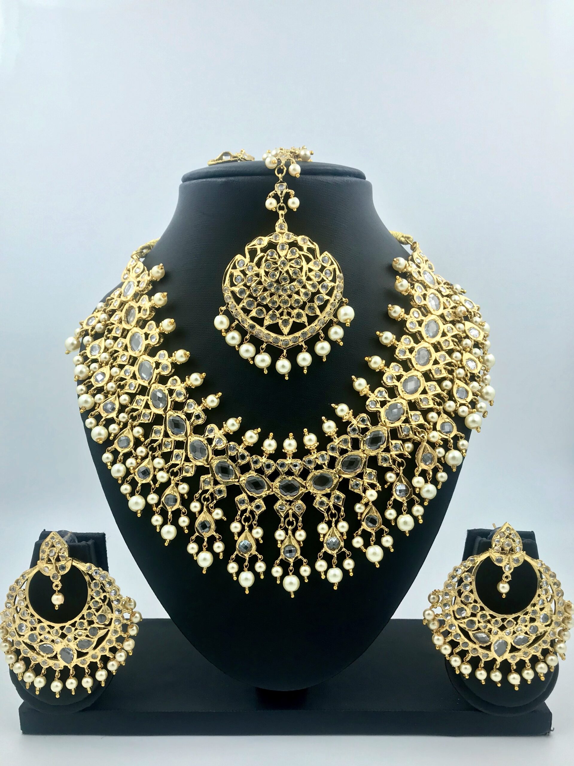 - Exquisite gold plated polki bridal set featuring a statement necklace, matching chandbali earrings and maang tika.