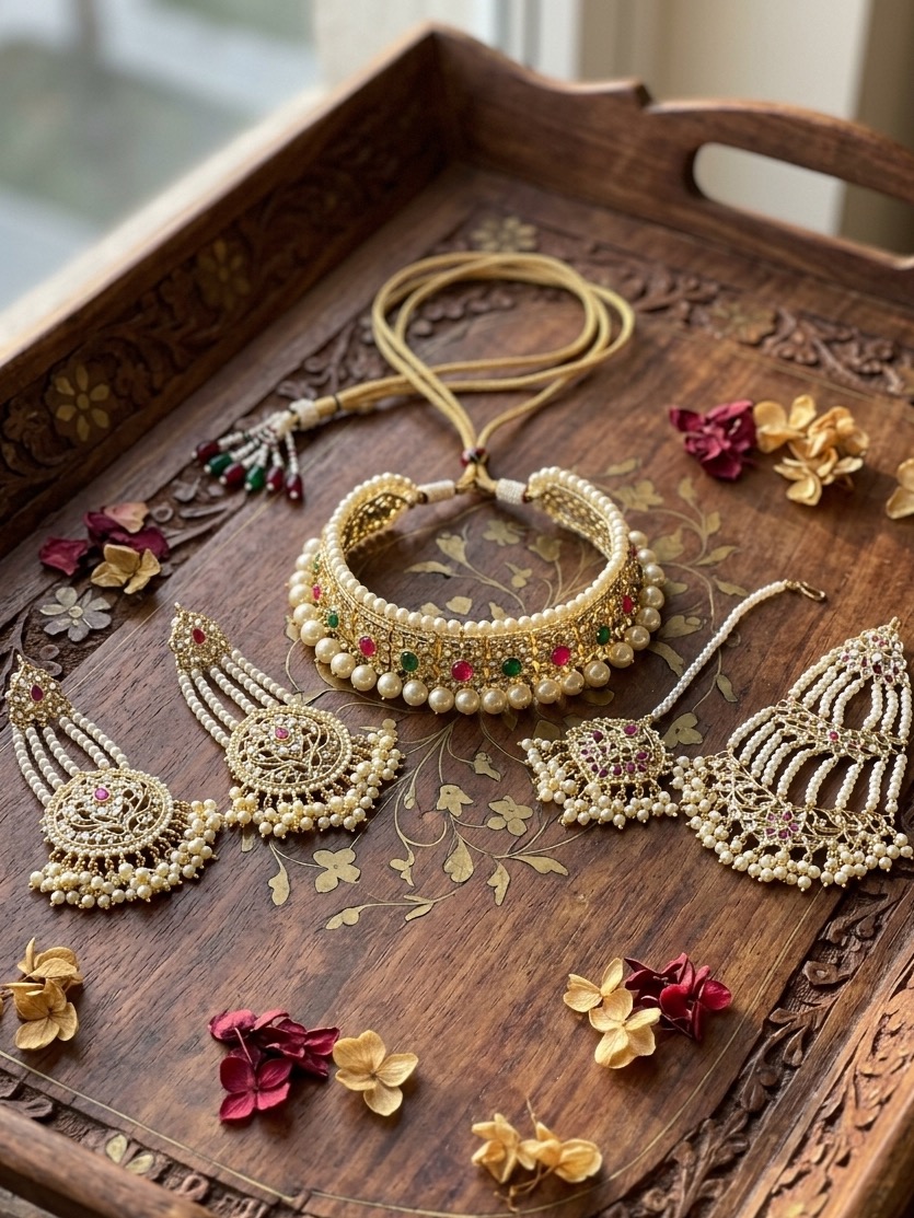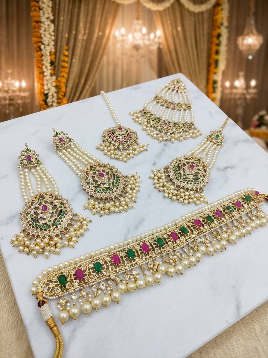- Includes statement choker, big earrings, jhoomer (passa), and maang tika