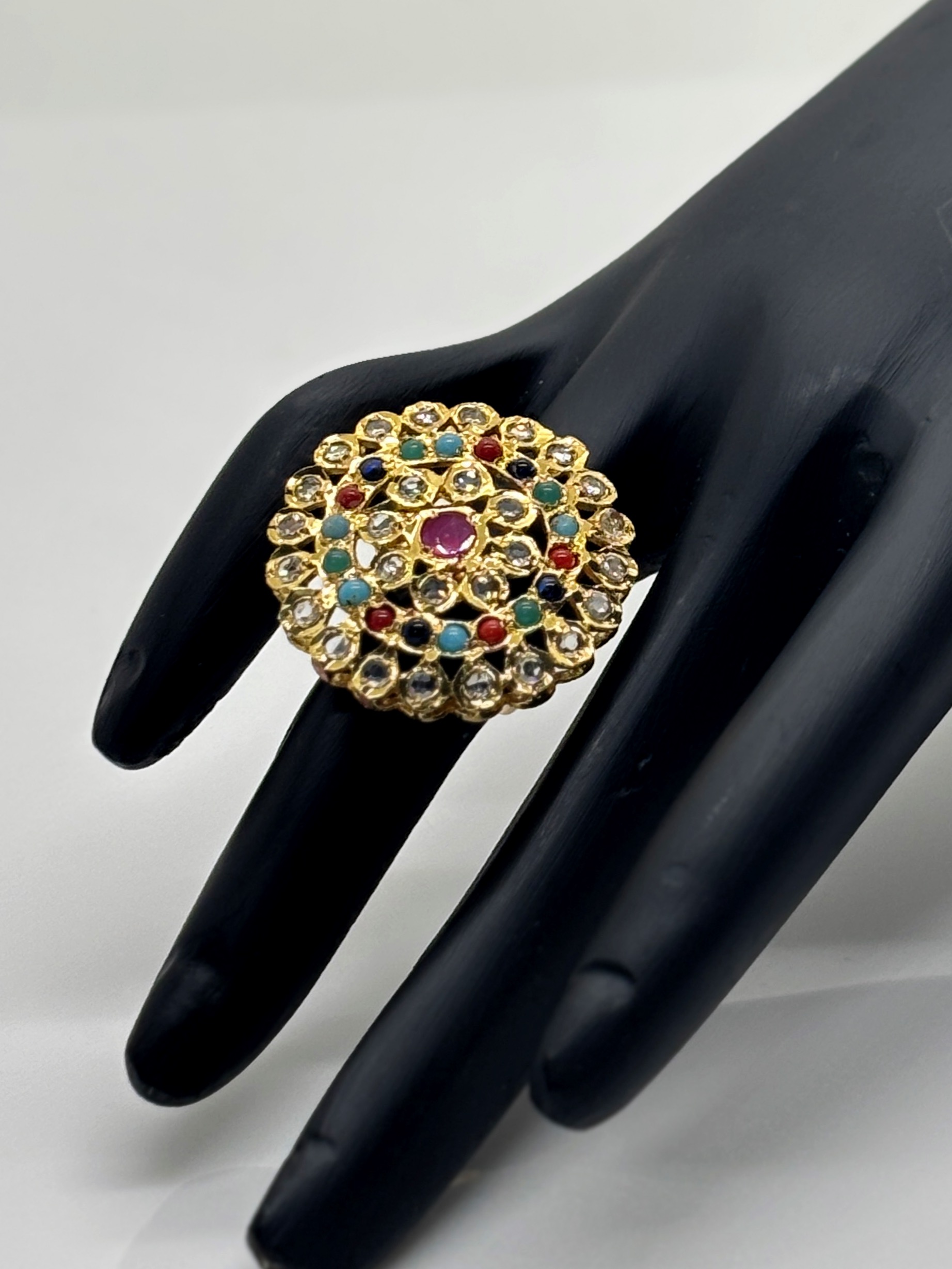 - Elegant gold plated polki statement ring designed in a bold big-size circular motif.