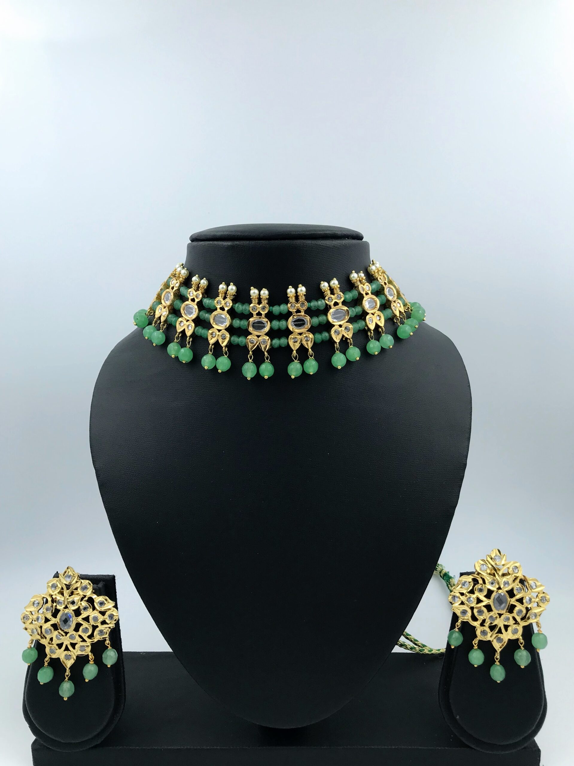 • Elegant gold plated polki choker set featuring a statement choker with matching big studs.
