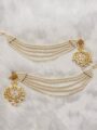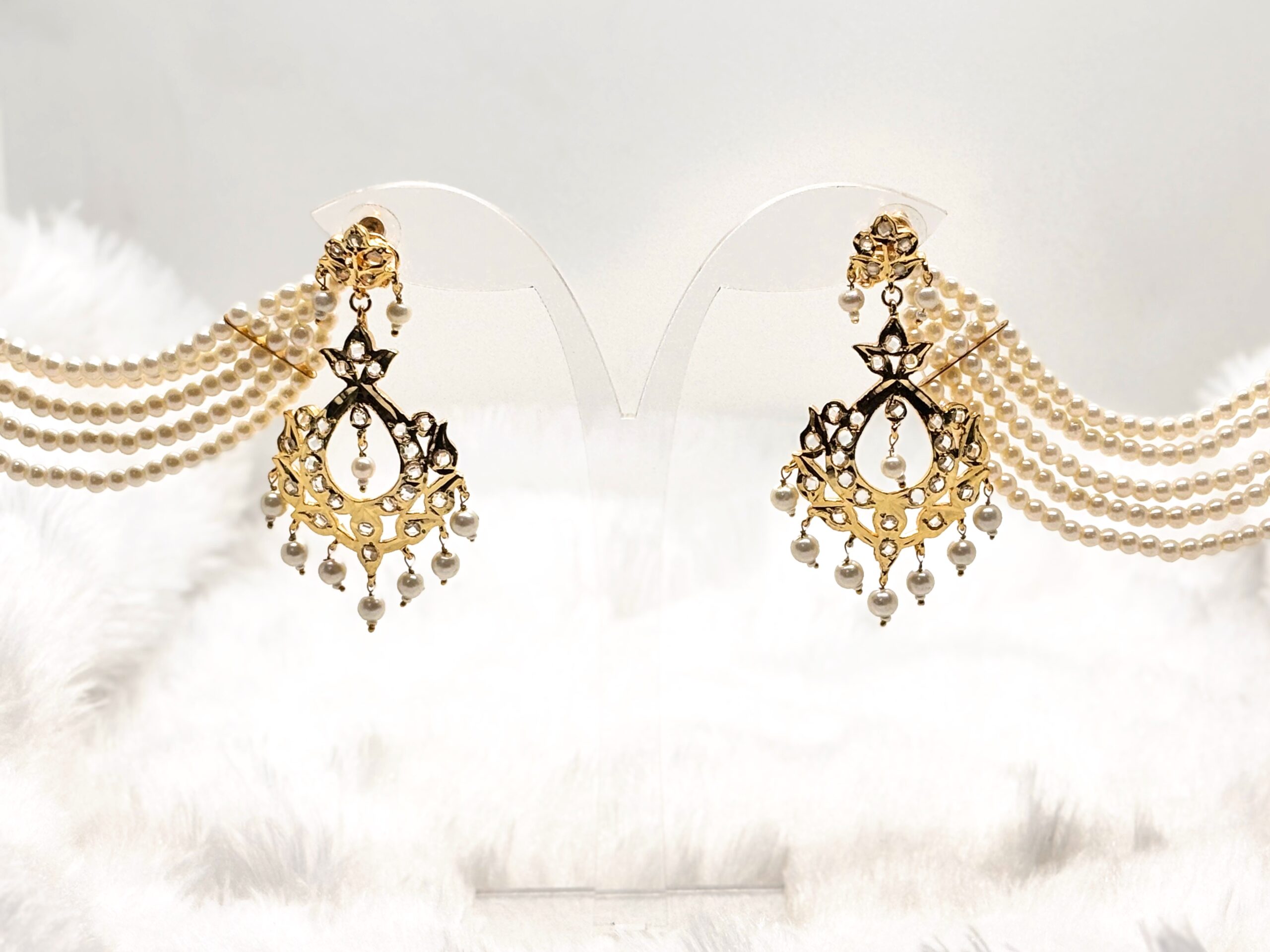 • Elegant Polki Hyderabadi earrings paired with graceful multi-layer pearl chains.