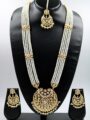 - Elegant gold plated jadau long haar set featuring a multi-strand pearl necklace with matching earrings and maang tika.