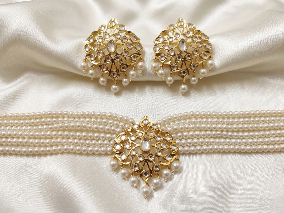 - Elegant gold plated polki choker set featuring a stylish pearl beaded choker with matching earrings.