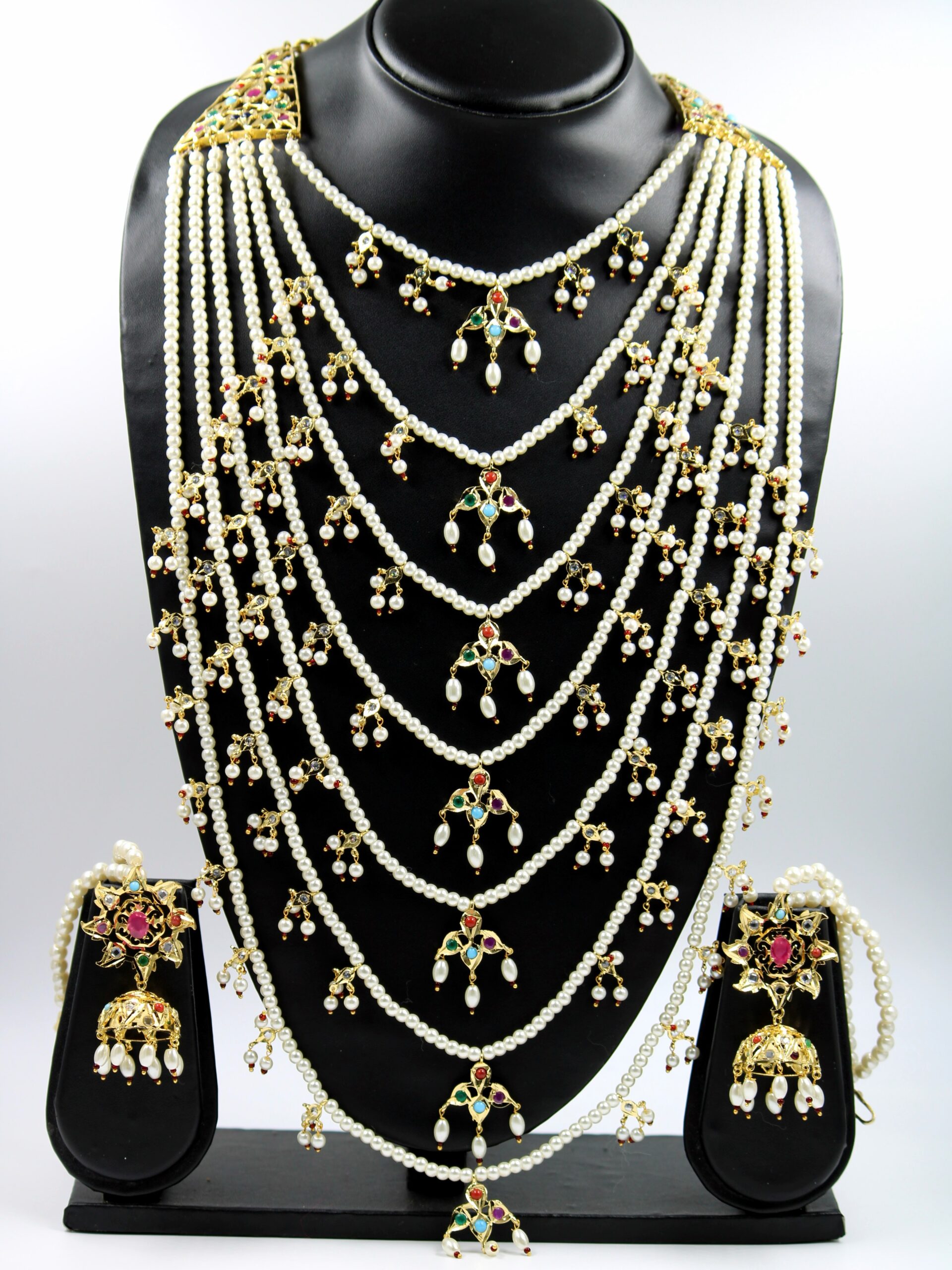 •Features a stunning multi-layer pearl haar that adds grandeur to any bridal or festive look.