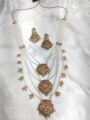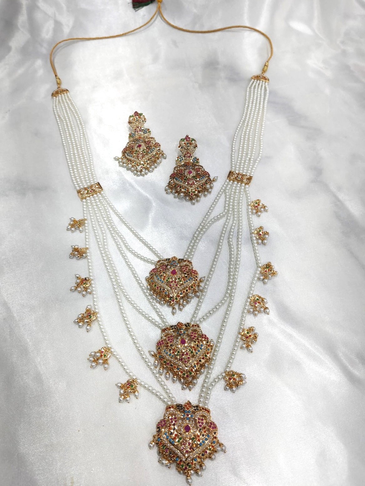 - Elegant gold plated jadau navratan necklace set featuring a multi-layer pearl necklace with matching earrings.